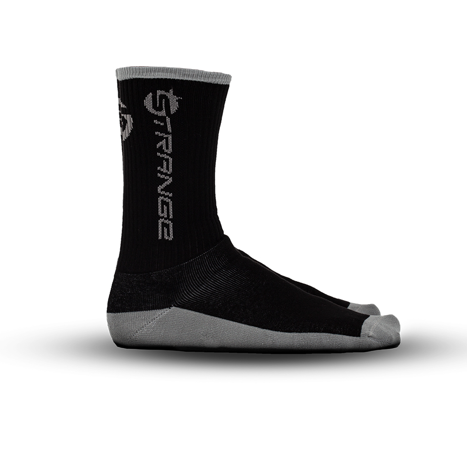 Be trail ready with our Elite riding sock. With the Strange logo on the side of the leg and the full logo on the bottom of the foot. Ride in comfort and shred in style! Seriously comfy cotton sock with wide comfort elastic with help support the calf whilst out ripping the trails.