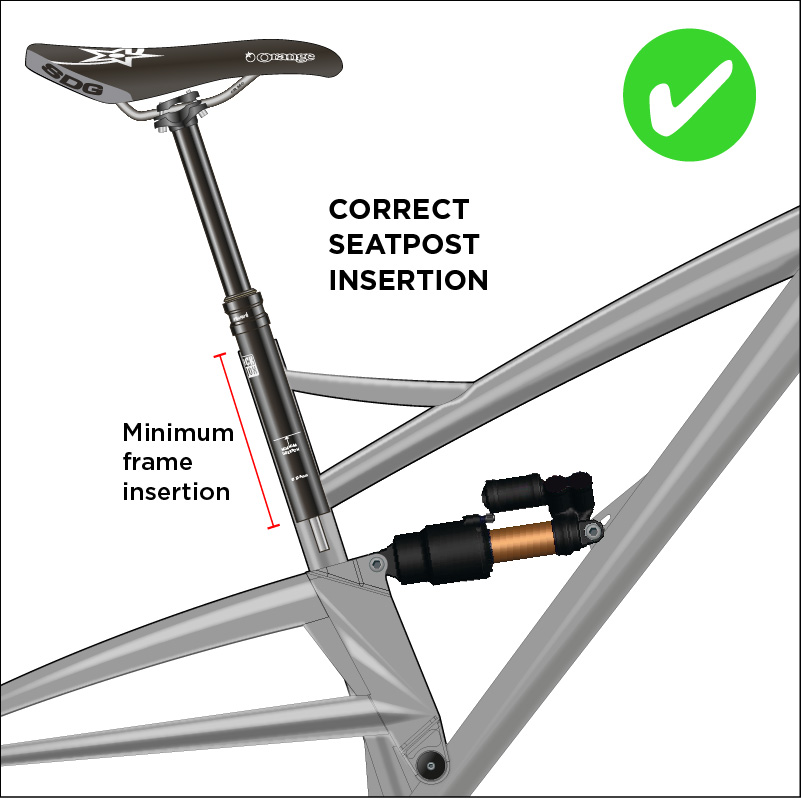 This set-up often means the dropper post’s collar is very close to the seat clamp on the frame. This is the correct set-up. Do not run a dropper seat post with a large amount of the lower insertion length visible to do so, you risk serious damage to your frame. An incorrectly inserted dropper seatpost will invalidate your warranty.